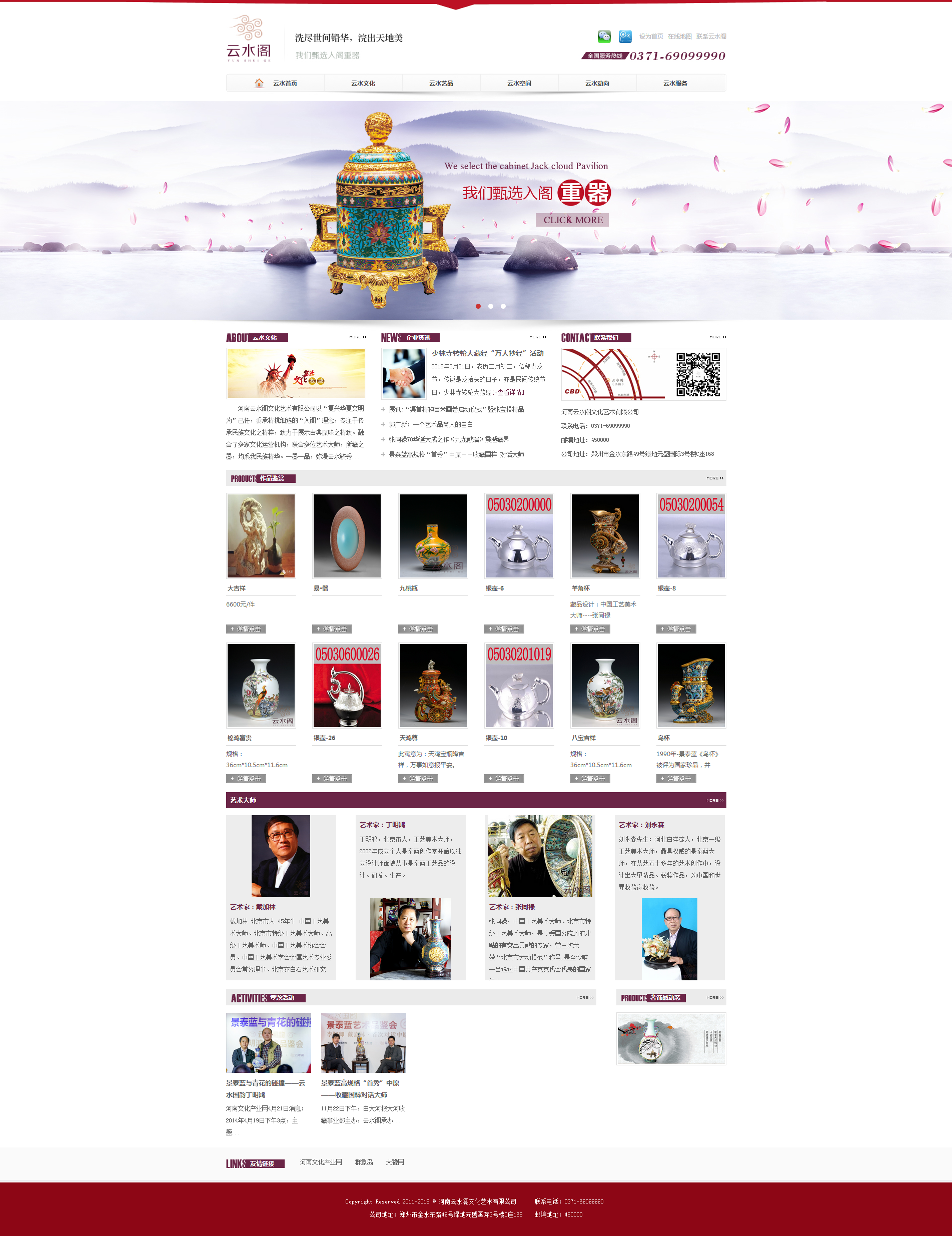 河南云水阁文化艺术有限公司以“复兴华夏文明为”己任,秉承精挑细选的“入阁”理念,专注于传承民族文化之精粹,致力于展示古典原味之精致。融合了多家文化运营机构,联合多位艺术大师,所藏之器,均系我民族精华。